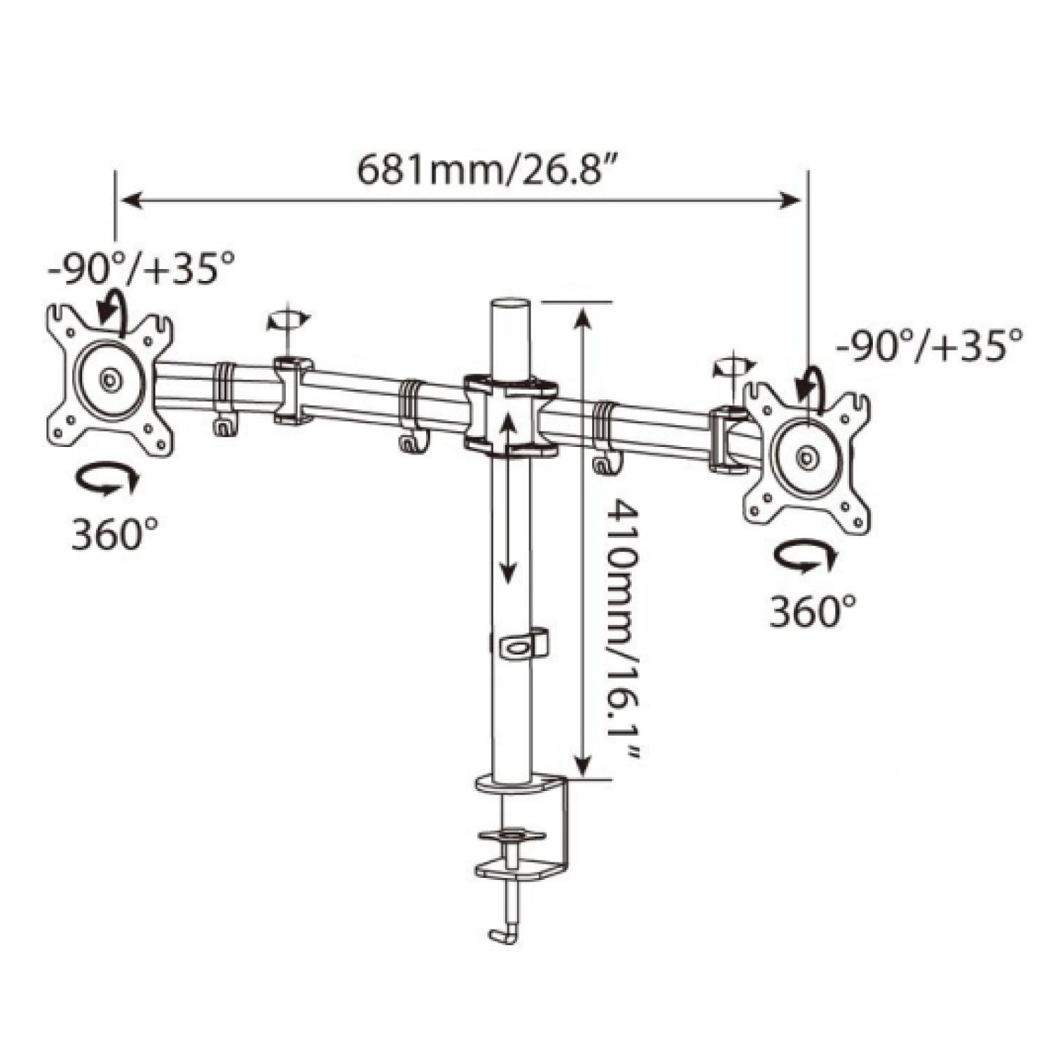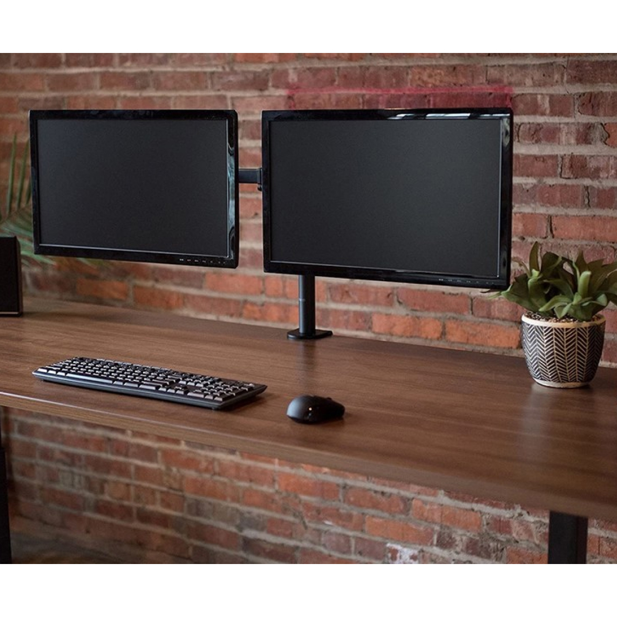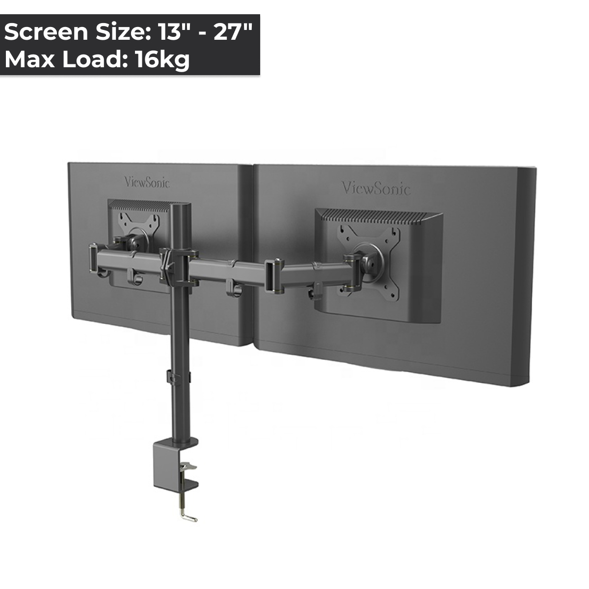 - Mounts 2 screens side by side to conveniently free up desk space.