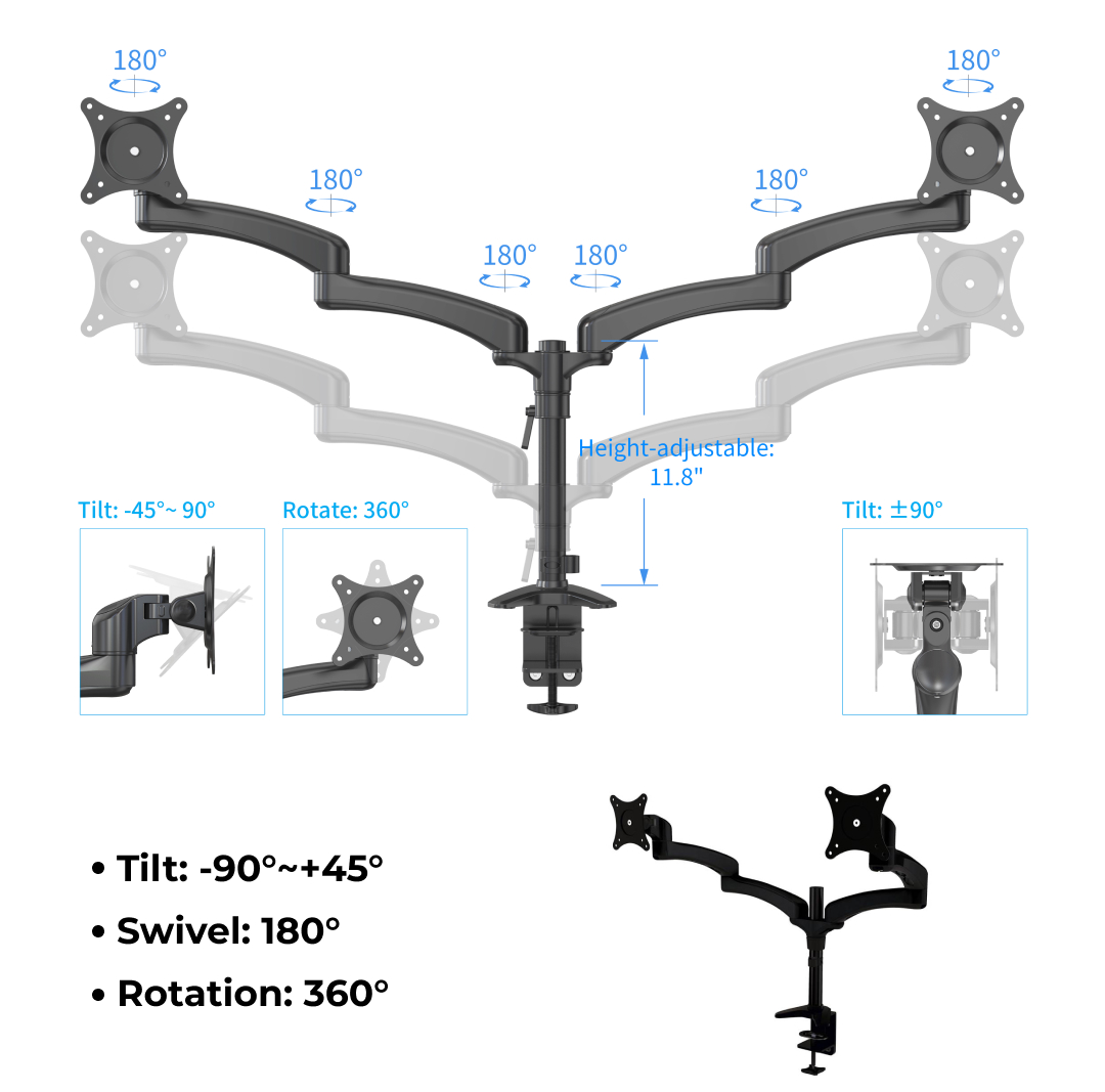 This dual monitor mount can be changed the height, lateral position, angle, and depth. It allows smooth, effortless rotating and positioning for any direction. The computer monitor stand allows you to work in a healthy posture by setting the monitor at an optimal distance and height. Say goodbye to back and neck strain!
