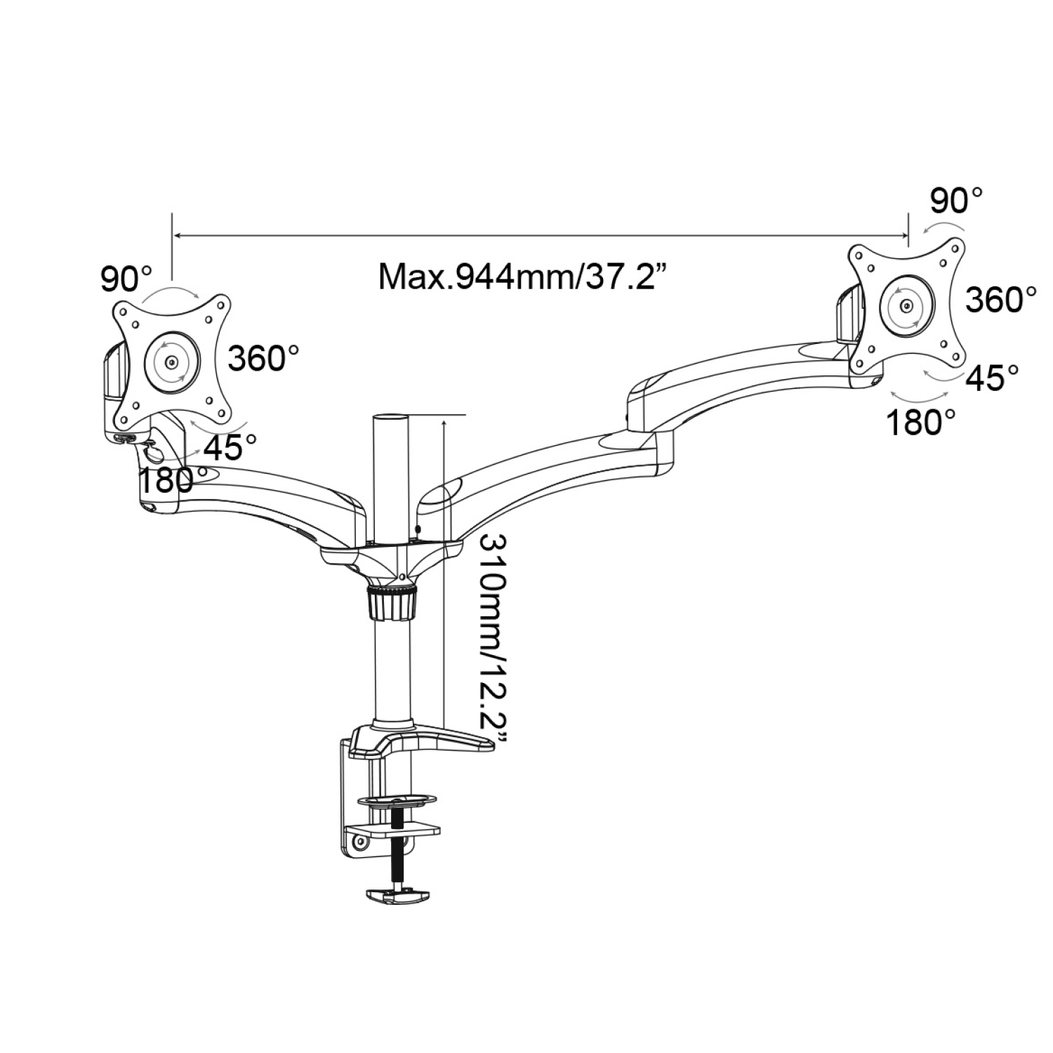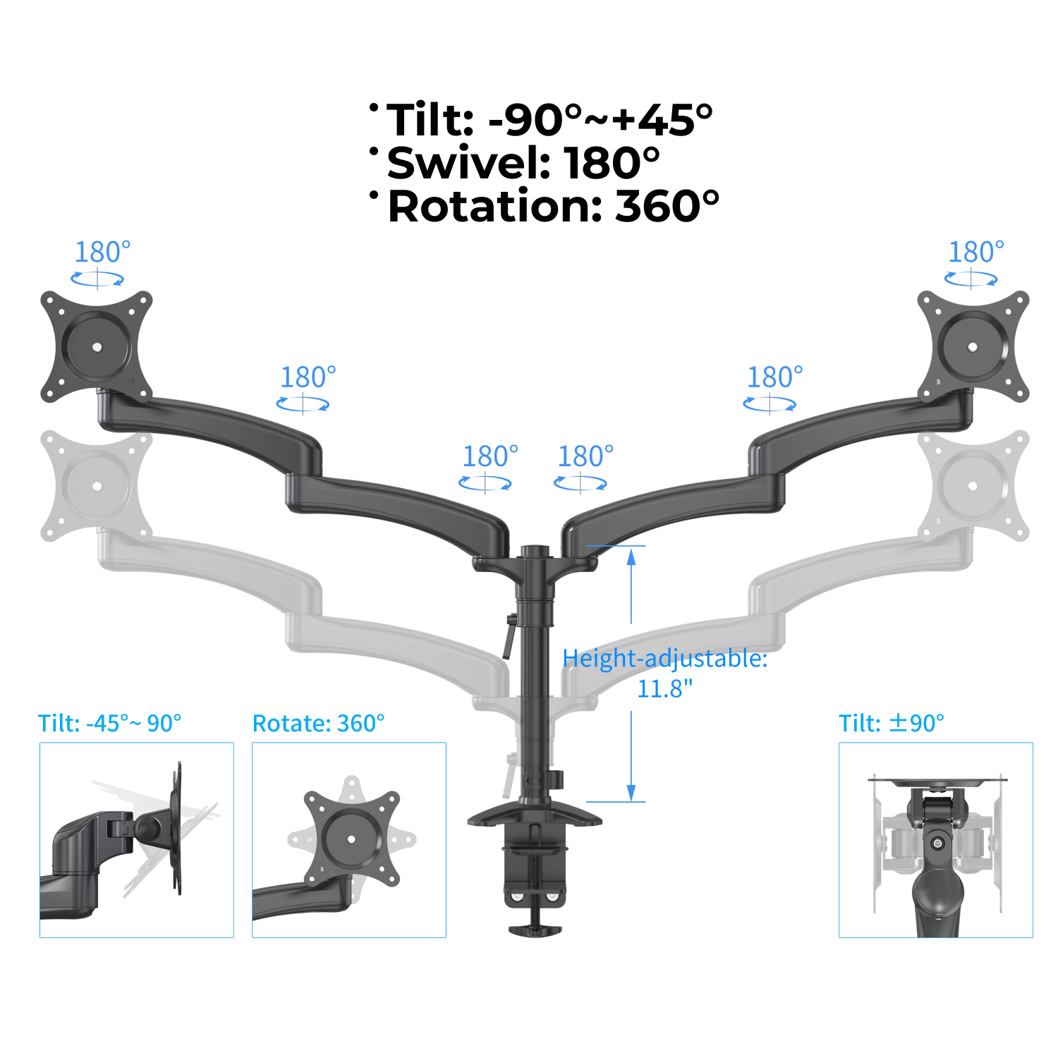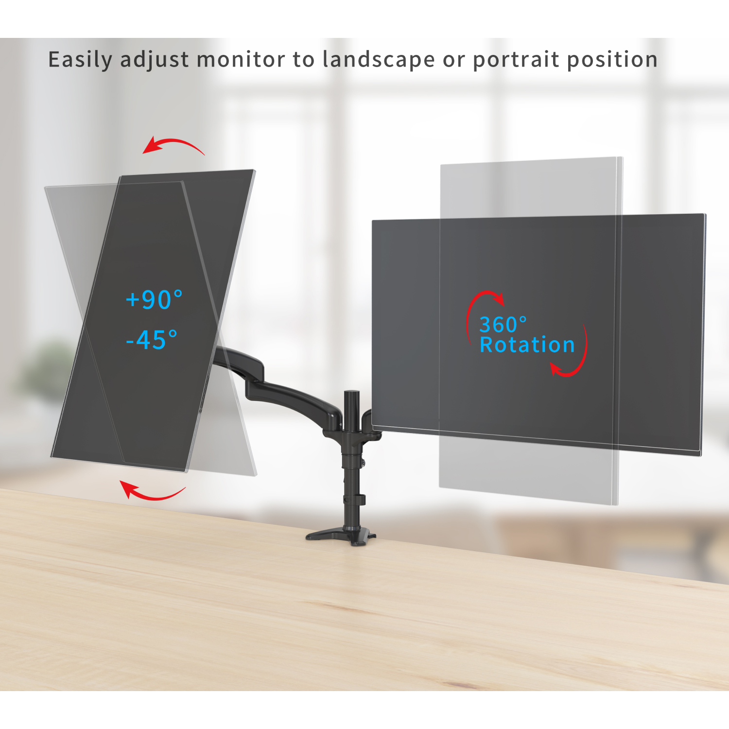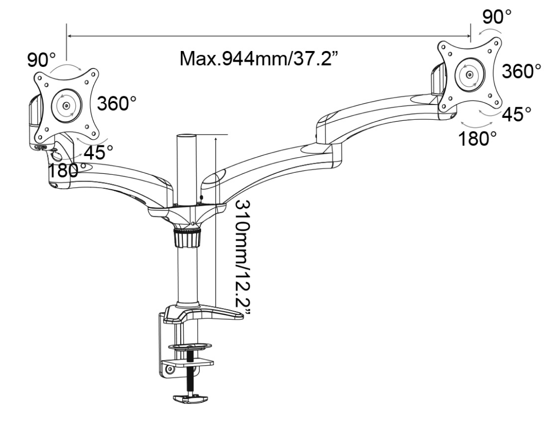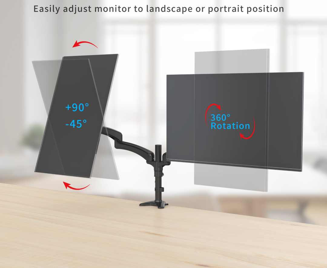 • Full-motion – Adjustable arm offers +45° to -90° degree tilt, 180° degree swivel, 360° degree rotation, and height adjustment along the center pole. The monitor can be placed in portrait or landscape shapes