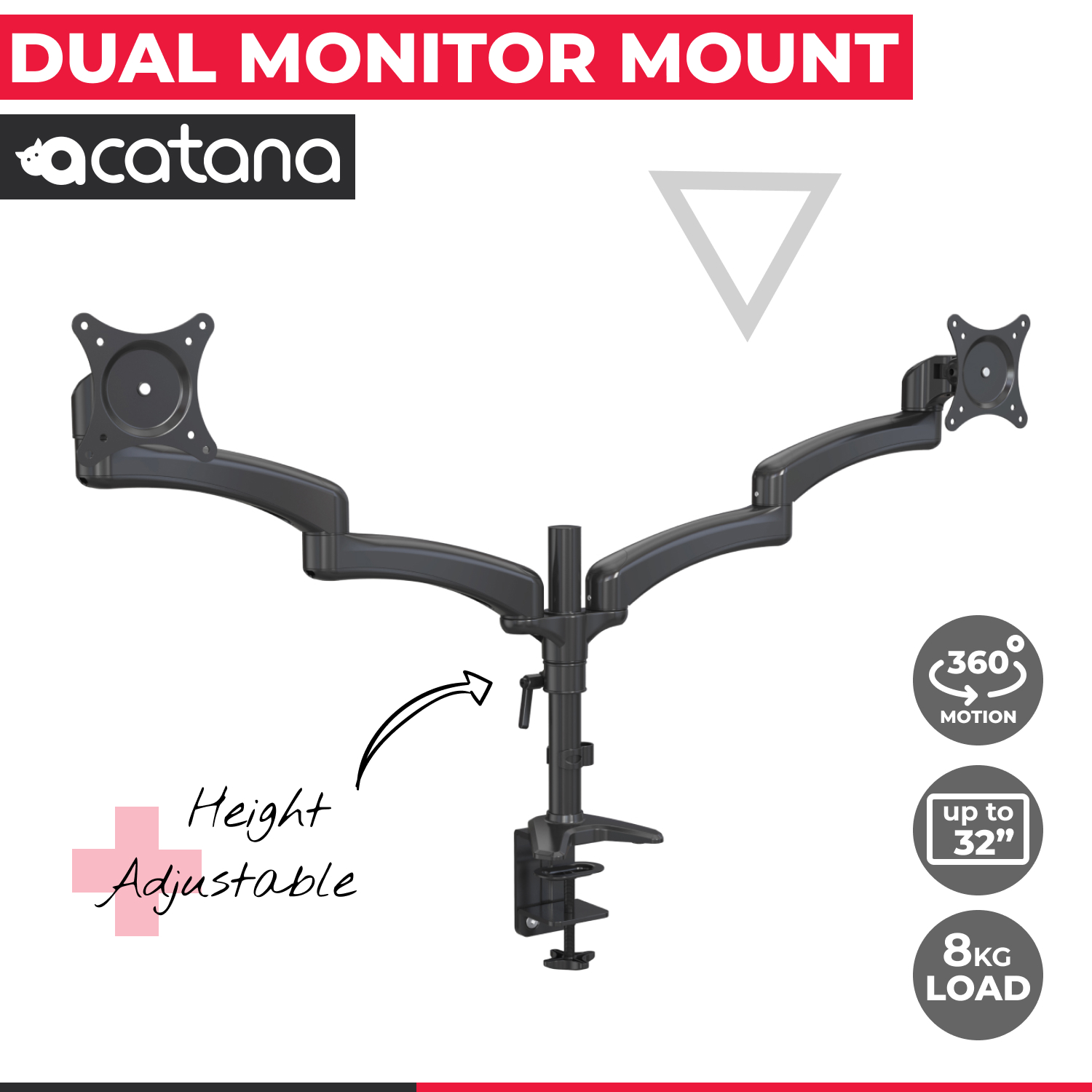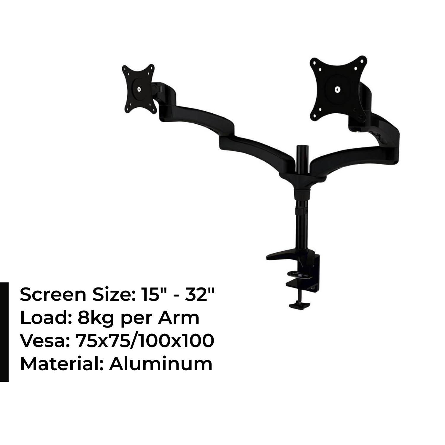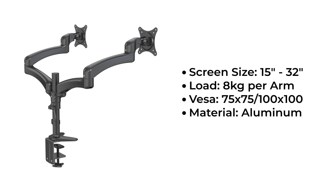 • COMPATIBILITY – Dual monitor mount fitting two screens 15” to 32” in size and 8kg each arm with 75x75mm or 100x100mm mounting holes
