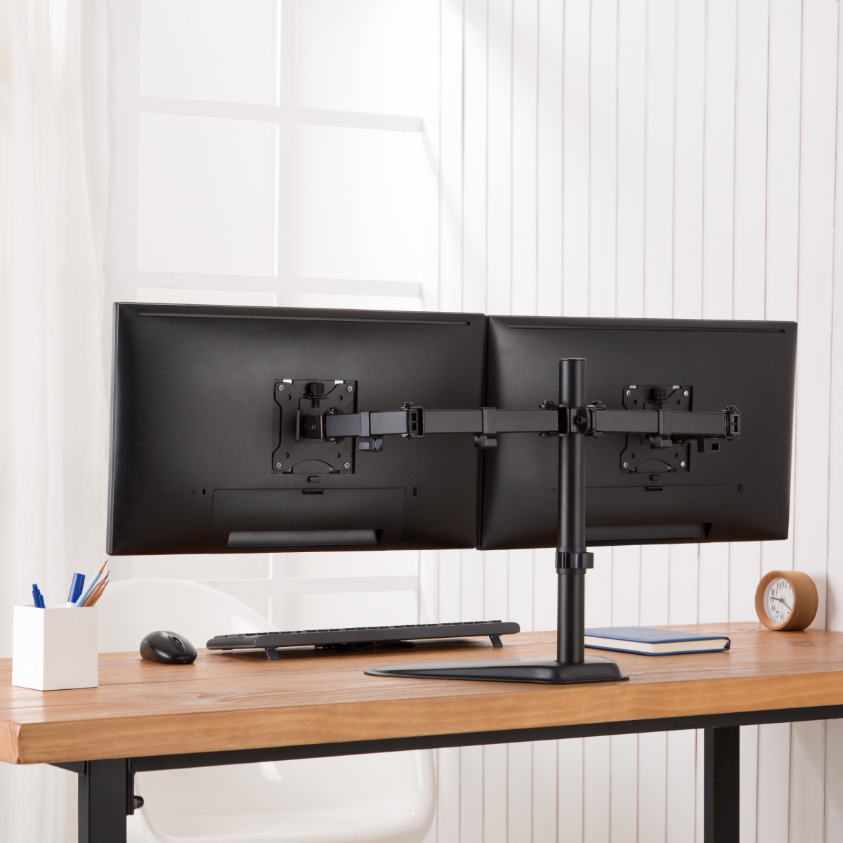 Acatana Freestanding Dual Monitor Stand 2 Arm Mount for Raise your monitors to an ergonomic position and work more efficiently with this dual monitor stand. Designed for performance, this monitor stand is made from high-strength steel for durability. The freestanding base sits on top of any desktop for quick installation. The arms can be raised or lowered on the pole for easy height adjustment. Tilt and swivel offer multiple monitor angles for comfortable reading, and integrated cable management keeps your cords off your desktop.