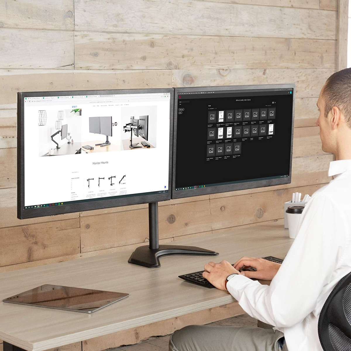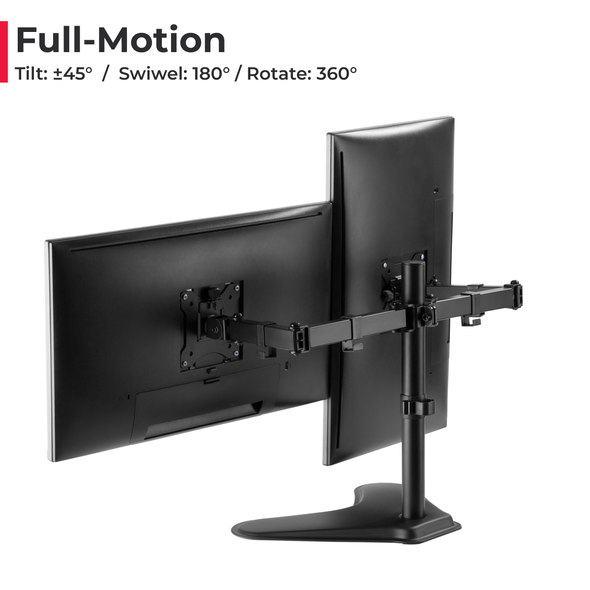 Double Benefits: Double efficiency and productivity to make working or relaxing that much more comfortable. Increasing more usable desktop space can help provide your displays with a new range of adaptive positions. Arms extend and retract, tilt to change reading angles, and rotate from landscape to portrait mode.