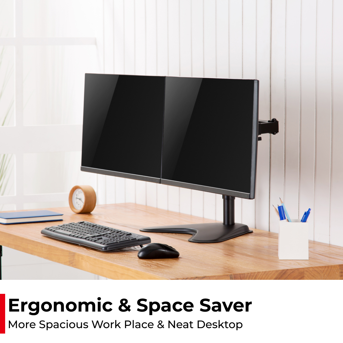 ACATANA dual monitor stand holds 2 monitors on 1 stand instead of directly standing two monitors on the desktop, effectively saving space on your desk and making your workstation spacious.