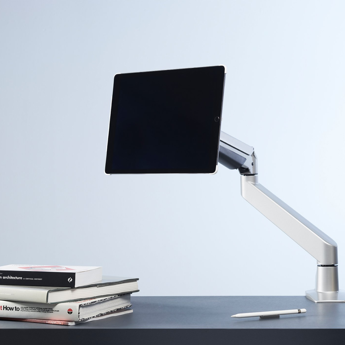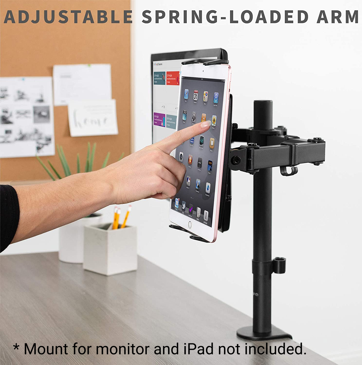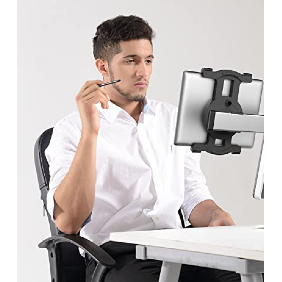 RUBBER PADS AND INCLUDED: Rubber pads on the tablet holder prevents scratches on your tablet and prevents the device from shifting in place when adjusting the monitor mount