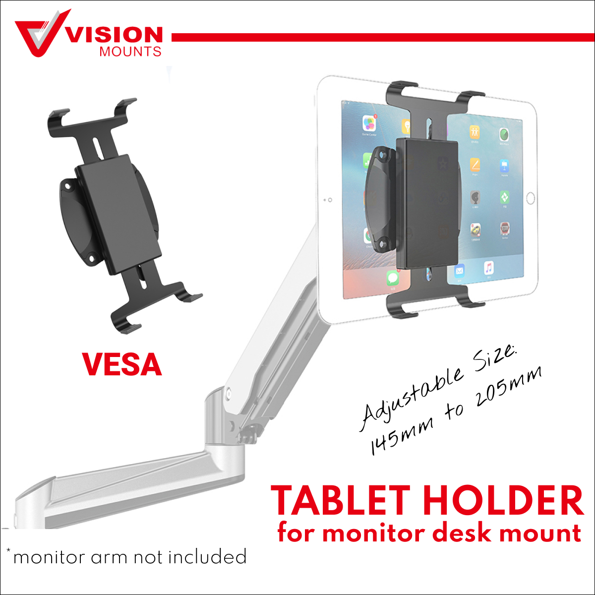 Vision Mounts VM-A69 | VESA Tablet Mount Adapter Universal Connector Adjustable Holder for Monitor Stand Arms fits iPad, Samsung This lazy holder is perfect for holding your phone or tablet firmly at the ideal distance and angle for convenient viewing, when you are lying, eating, reading, cooking, typing, writing, watching movies, or playing games. Adjustable Design – The spring-loaded arm pulls out to accommodate a variety of screen sizes. When the mount is fitted to your tablet, simply tighten the two thumbscrews to secure it in place. Low Profile – The minimalistic design and black colour blend well with a variety of laptops and portable monitor setups, creating an unobtrusive and low profile appearance.
