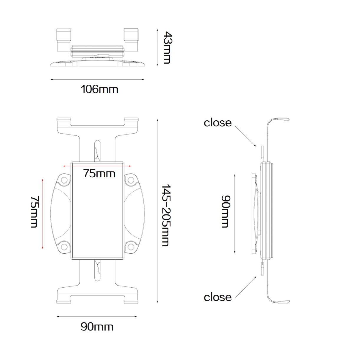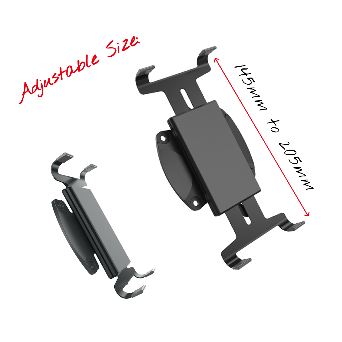 FULLY SECURED: Adjustable side clips (145mm to 205mm width adjustment range) hold your device firmly. Two separate locks on each side allow you to adjust the width easily according to the size of your device and lock the clamp extremely tight.